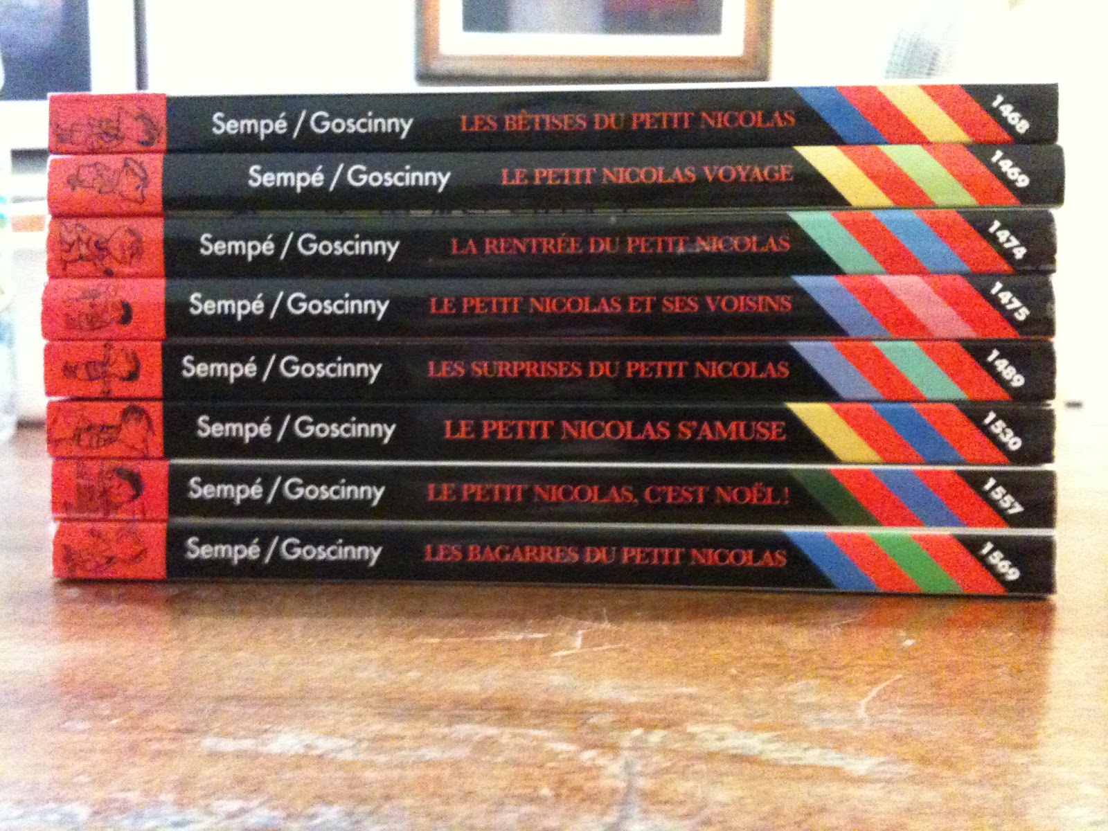 De cima para baixo: Vol. 1 - Les bêtises du Petit Nicolas; Vol. 2 - Le Petit Nicolas Voyage; Vol. 3 - La rentrée du Petit Nicolas; Vol. 4 - Le Petit Nicolas et ses voisins; Vol. 5 - Les Surprises du Petit Nicolas; Vol. 6 - Le Petit Nicolas s'amuse; Vol. 7 - Le Petit Nicolas, c'est Noël! Vol. 8 - Les bagarres du Petit Nicolas