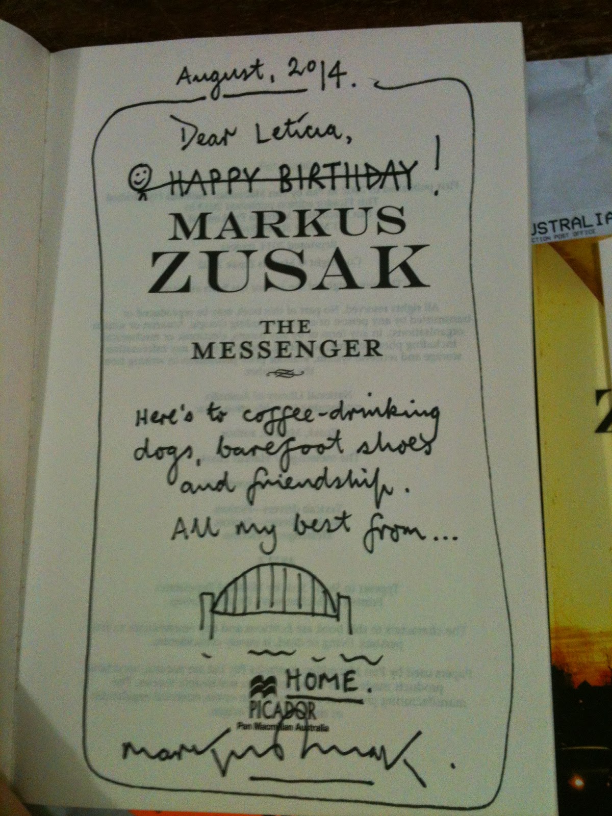 Desci para ver o que tinha de entrega. Aí notei um envelope que já conheço pela cor, apesar de só ter recebido uma vez algo assim. MARKUS ZUSAK ME DESEJOU FELIZ ANIVERSÁRIO E MANDOU UM LIVRO PRA MIM!